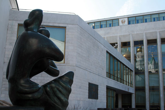 Скульптура Генри Мура у входа в Одностолпную палату в Кремле.Остальные работы представлены в стеклянных витринах в полумраке Успенской звонницы и Одностолпной палаты – эскизы и модели. Круглая скульптура, предназначенная для просмотра со всех точек зрения, место притяжения внимания в пейзаже съеживается до обычных экспонатов этих помещений – имперской антикварной ювелирки разных времен и народов. Собственно, Мур в этот ряд отлично вписывается – с его обтекаемой тематикой, в меру проблематичной и в основном позитивной, скульптурами, значащими все и одновременно ничего, славой материнству и природе, указанием на разрушительность войны, является лучшим международным дипломатом от искусства. Возможно, кто-то надеялся, что событие в том, что государство меняет свое отношение к современному искусству, делает шаг в сторону настоящей демократии – это не так. Скульптуры Мура отлично вписываются в любые государственные идеологии былых империй и колоний. Источники скульптора широки – от африканской скульптуры до итальянского Возрождения. Но Пикассо и другие модернисты полюбили африканцев за то, что они способны были потрясти основы европоцентристского мировосприятия, хотя бы в визуальном плане, а люди Ренессанса ратовали за разум человека, подчиняющий себе иррациональное. Мур из всей мировой истории искусств извлекает примитивные инстинкты и банальные истины, которые годятся как аргументы для доказательства любой идеи.