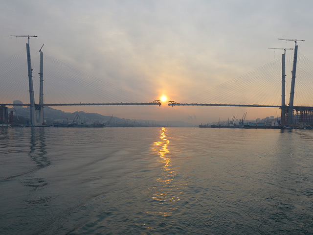 Строители моста через бухту Золотой Рог во Владивостоке в субботу установили центральную панель пролета перехода, соединив тем самым два противоположных берега бухты, передает "Интерфакс".