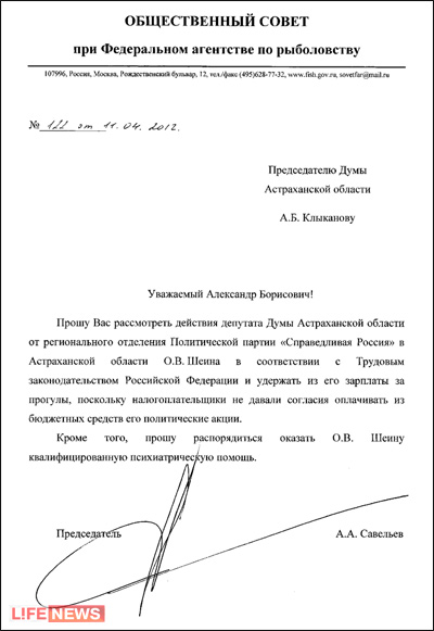 Между тем, как пишет LifeNews, общественный совет Росрыболовства обратился в Астраханскую областную думу с просьбой лишить Шеина зарплаты за прогулы. Официальное обращение к председателю Астраханской областной думы Александру Клыканову направил глава общественного совета ведомства Александр Савельев. "Налогоплательщики не давали согласия оплачивать из бюджетных средств его политические акции", — отмечается в письме.