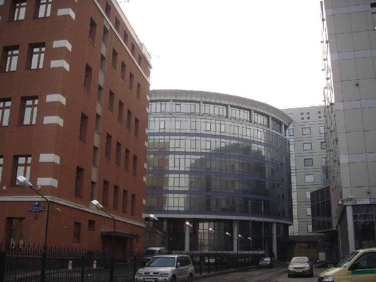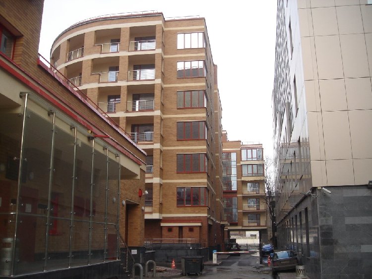 И снова – офисы пустуют, квартиры не заселены. А вообще такое сочетание смотрится как-то дико: жители домов обречены наблюдать вечную суету клерков, движение их машин, среднеазиатский обслуживающий персонал. Более обдуманным стала бы не продажа квартир в собственность, а их сдача в аренду – тем же самым работникам соседних офисных центров. А это вид на тот же квартал со стороны Озерковского переулка: