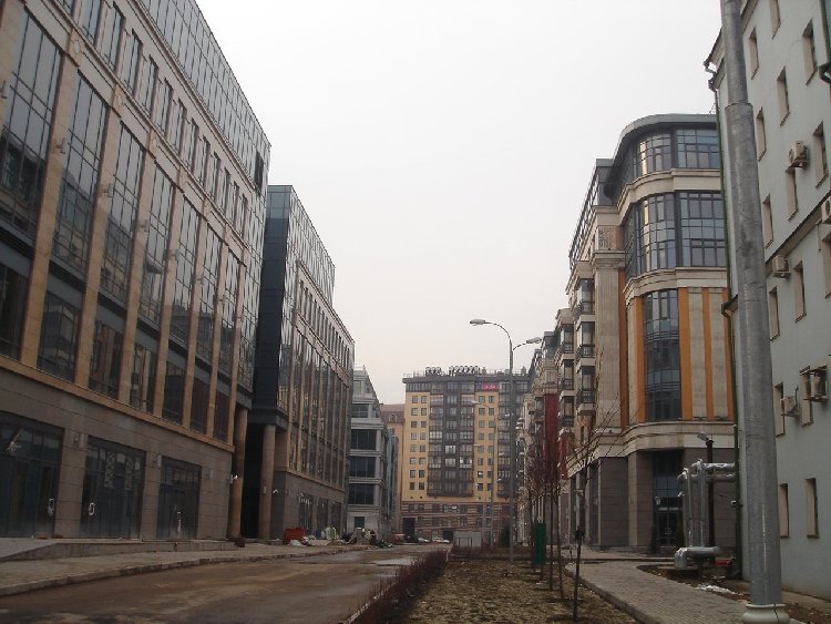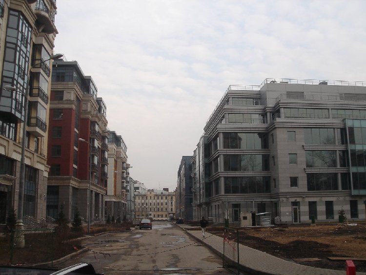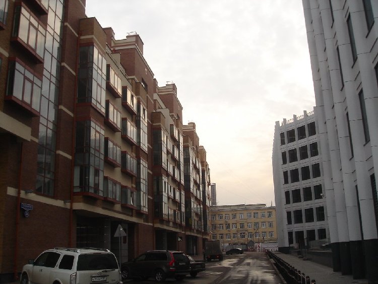 Ещё один задник «элитного» квартала. Справа виден примыкающий к нему почти вплотную очередной безвкусный бизнес-центр (тоже производящий ощущение пустого). Таким образом, жилой квартал зажат с обеих сторон бизнес-муравейниками: