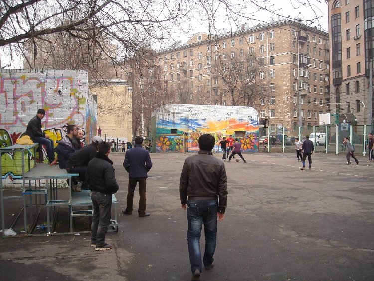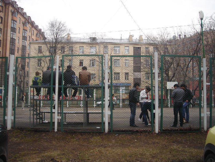 А это спортивная площадка метрах в 50-ти от элитного дома. На ней каждые выходные собираются поиграть в футбол гастарбайтеры из Азии. Обычно противостоят друг другу команды, сформированные по географическому принципу: узбеки против таджиков, ошские против бишкекских: