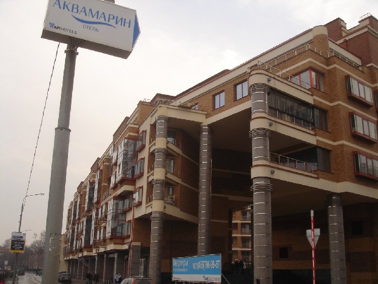 Слева от этого вавилон-центра располагается элитный жилой дом, построенный той же фирмой Леваева. Дом называется «Аквамарин». Года три-четыре назад продажи в нём стартовали с 20 тыс. долларов за метр, в кризис цены скинули до 12 тыс. Но объявления о продаже висят до сих пор. Осмотр дома показал, что заселены в нём или делаются ремонты максимум в трети квартир. Этот элитный квартал, несмотря на то, что сдан уже больше года назад, выглядит пустым. Во внутреннем дворике не видно людей, нет подъезжающих/отъезжающих машин, не слышно никаких звуков. Очередной «инвестиционный проект», продукт московского «пузыря недвижимости»: