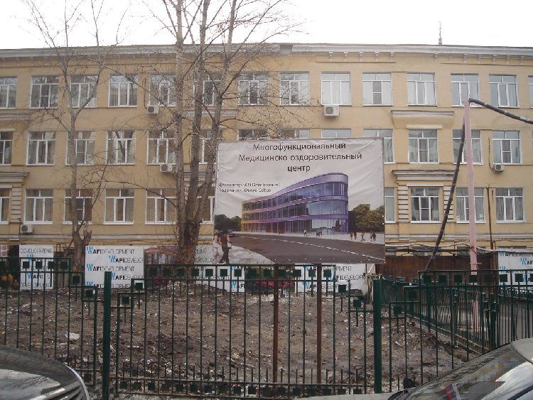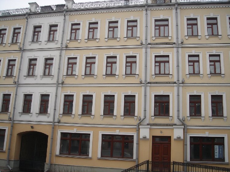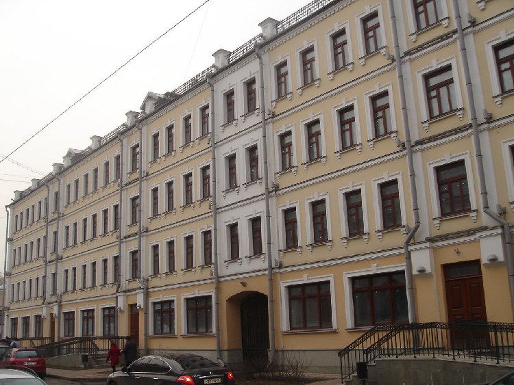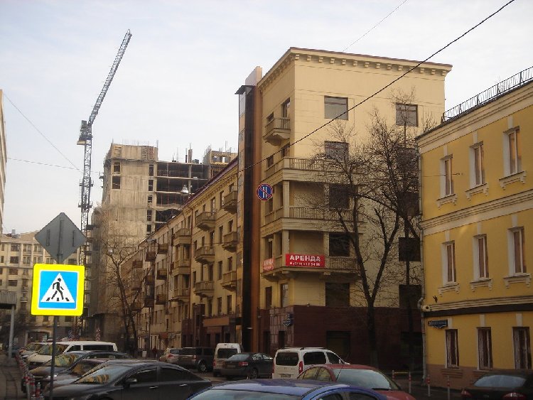 Процесс жилой застройки идёт в районе в обе стороны – тут как заселяют новые дома, так и выселяют из старых. Вот пример такого переоборудования жилого дома в офисно-гостиничный комплекс. Ещё пару лет назад дом разваливался на глазах – с него сыпалась лепнина, падали куски балконов. Потом нашёлся какой-то инвестор, выселил куда-то жителей (хочется верить, что они остались жить в Москве, и вообще живы), кардинальным образом его реконструировал (вплоть до облицовки мрамором) и заменил квартиры гостиничными номерами и офисами (на объекте полотнище «аренда»):