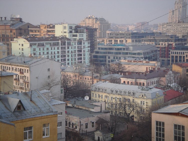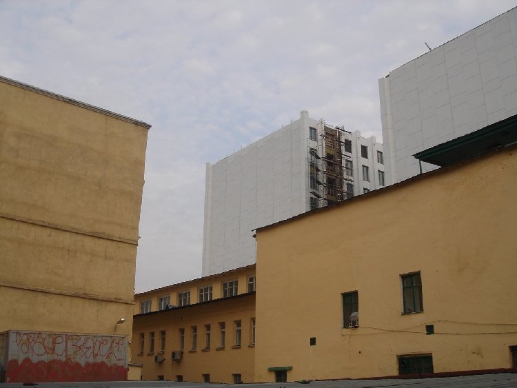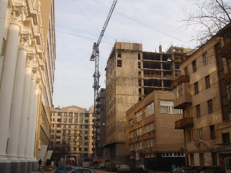 На дальнем фоне виден ещё один элитный дом, стоящий на улице Бахрушина. Он запомнился тем, что на нём погорел Рябинин, заместитель мэра Лужкова. По данным следствия (оно ещё идёт), Рябинин вымогал у застройщика помещение стоимостью 6 млн. рублей. Сумма кажется совсем несерьёзной – 200 тыс. долларов в этом доме стоили 15-20 кв. м (продажи в нём шли по 10-13 тыс. долларов за метр). Что за кладовка приглянулась вице-мэру?