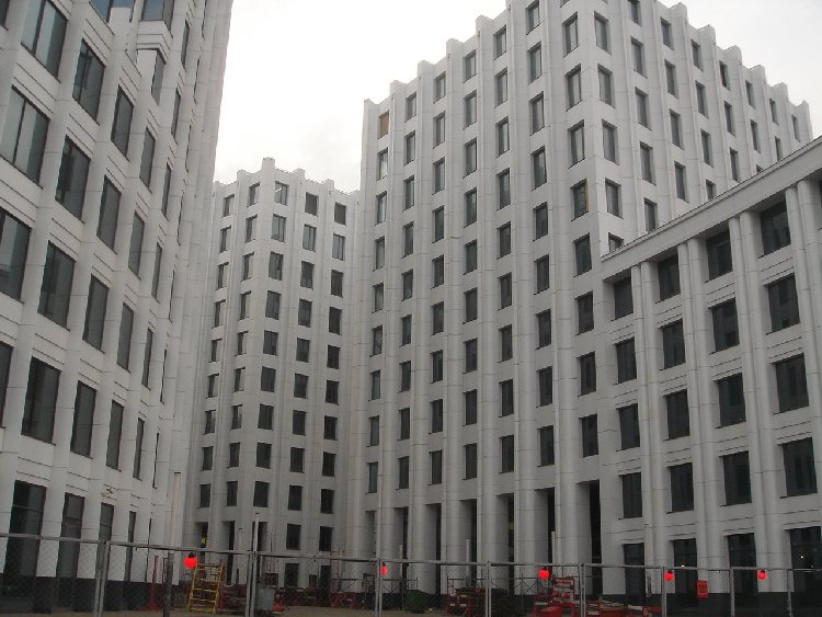 Теперь тут на территории 3,5 га появилось около 140 тыс. кв. м офисной и жилой недвижимости. Рейдерам было за что бороться: даже при цене за метр офисов в 5 тыс. и квартир в 10 тыс., вся эта недвижимость потянет на 1 млрд. долларов. При доходности в 20% чистыми срубить получится 200 млн. долларов. Выглядит этот микст так (слева жилые дома, справа офисы, фото со стороны Руновского переулка):