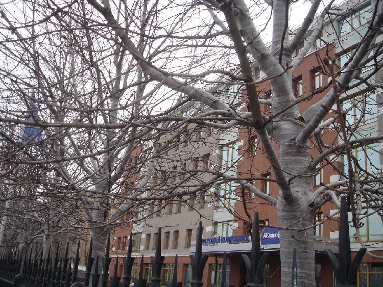 А это пример заботы о собственной природе: на территории одной страховой компании стоят обмотанные укрывным материалом (видимо, лутрасилом) каштаны. Это делается для предупреждения морозобоин, повреждающих кору: