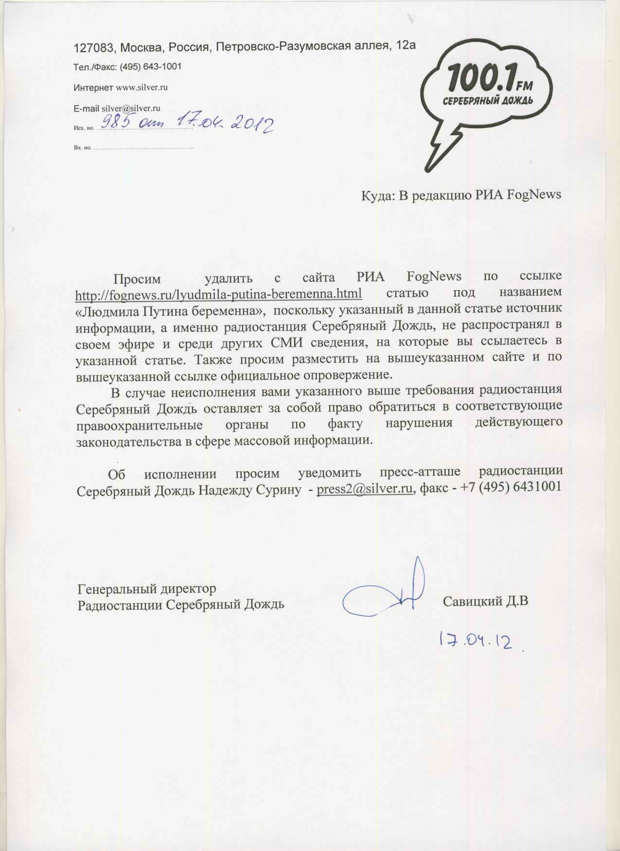 Первой тревогу забила радиостанция "Серебряный дождь", в эфире которой Валентина Матвиенко якобы сообщила о беременности. Редакция обратилась с официальным письмом к ресурсу, попросив удалить материал, "поскольку указанный в данной статье источник информации, а именно радиостанция "Серебряный дождь", не распространял в своем эфире и среди других СМИ сведения, на которые вы ссылаетесь в указанной статье". От FogNews требуют официального опровержения новости. "В случае неисполнения вами указанного выше требования радиостанция "Серебряный дождь" оставляет за собой право обратиться в соответствующие правоохранительные органы по факту нарушения действующего законодательства в сфере массовой информации", — говорится в письме. В разговоре с PublicPost пресс-аташе радиостанции Надежда Сурина подтвердила серьезность намерений "СД".