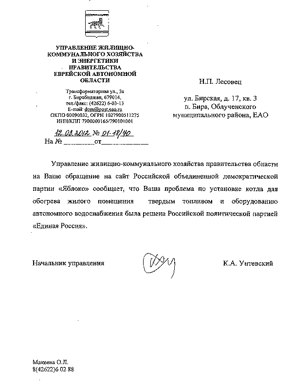 В конце прошлого года в электронную общественную приемную «ЯБЛОКА» обратилась многодетная мать Н. П. Лесовец из поселка Бира Еврейской автономной области. Просила она воздействовать на местные власти с целью обеспечения ее жилья паровым отоплением – вместо электрического – крайне неудобного и затратного.