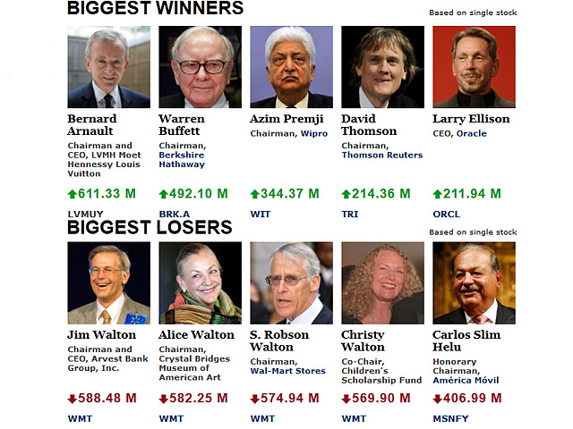 Так, например, в минувший понедельник в течение всего двух часов с начала торгов на бирже состояние мексиканского бизнесмена Карлоса Слима, держателя контрольного пакета акций America Movil, увеличилось на 500 млн долларов, а под конец дня он подтвердил статус богатейшего человека мира, заработав еще один миллиард долларов, передает РИА "Новости". Европейцы в этот день были менее удачливы. Так, Бернар Арно, владелец контрольного пакета акций французской компании LVMH, потерял за день около 1,1 млрд долларов.