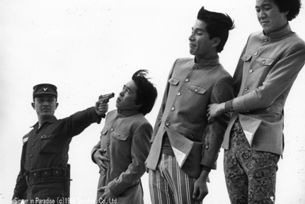 Диктор: ''Отношение японского общества к корейскому меньшинству возмущало Нагису Осиму, и возмущение это отразилось в ''Исследовании непристойных песен Японии'' и великолепной ''Смертной казни через повешение'' – сложносочиненном, сюрреалистическом порицании смертной казни и расизма. Картина ''Возвращение трех пьяниц'' раскрыла эту тему еще глубже и стала самым громким антивоенным заявлением режиссера в самый разгар Вьетнамской войны. Этот гневный бунтарский вопль начинается как сумасбродный бурлеск, но заканчивается настоящим блицкригом шокирующих образов своего времени (визуальным лейтмотивом послужил снимок Эдди Адамса ''Казнь в Сайгоне'', за который фотограф был удостоен Пулитцеровской премии)''.