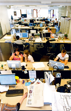 Однако да, Masterskaja Ланфранко Чирилло здесь: пространные залы с окнами во всю стену, десятки столов, десятки же уткнувшихся в компьютеры по большей части молодых людей — безымянных архитекторов, дизайнеров, инженеров-конструкторов, аккумулированных под одним именем — Lanfranco Cirillo.