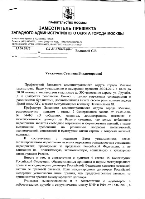 Что же касается упомянутого выше митинга солидарности с российскими буддистами, то чиновники и здесь не стали заморачиваться с подбором новых формулировок, дословно повторив текст от 16 марта. “В соответствии с поданным Вами уведомлением, целью запланированного мероприятия является выражение солидарности в отношении мероприятий, проводимых за пределами Российской Федерации, и не влияющих на политическую, экономическую и социальную жизнь граждан России”, говорится в ответе префектуры ЗАО от 13 апреля.