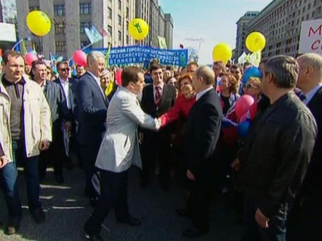 Самым необычным в нынешнем первомайском шествии заранее назвали участие президента РФ Дмитрия Медведева. "Встретимся на демонстрации", - сказал глава государства в минувшую пятницу на встрече с активом "Единой России". Как оказалось, на демонстрацию он собрался не один. Вместе с уходящим главой государства на Манежную площадь во вторник утром прибыл премьер-министр и избранный президент РФ Владимир Путин.