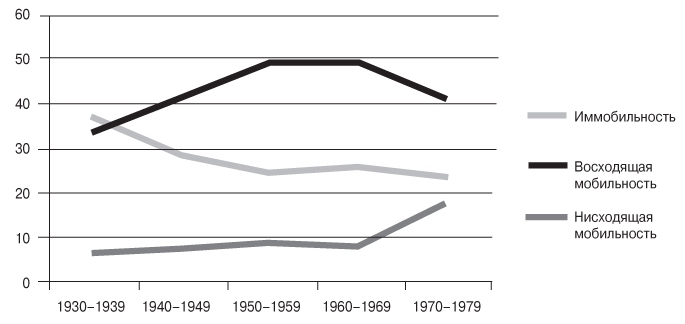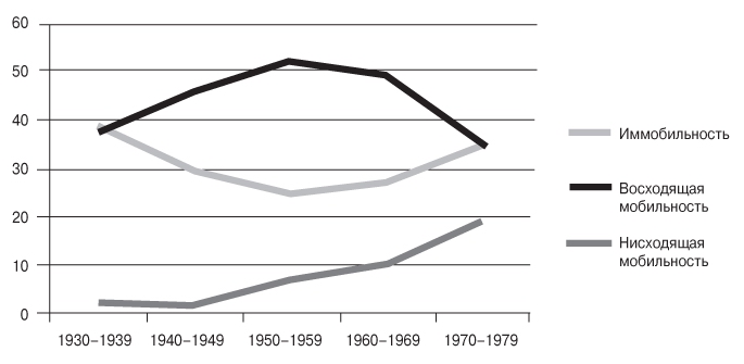 В социологии принято различать абсолютную и относительную мобильность. Абсолютная — это процент детей, изменивших (вверх/вниз) или не изменивших классовую принадлежность по сравнению с родителями. На нее влияют процесс урбанизации и структурные изменения в экономике, такие как уменьшение доли аграрного сектора, рост промышленности, сферы услуг, интеллектуальной составляющей в производстве. Иными словами, когда потребность в одних рабочих местах и профессиях снижается, а в других возрастает, люди вынуждены к этому приспосабливаться. На рис. 1 показано, как менялась от когорты к когорте, то есть фактически во времени, абсолютная мобильность (восходящая, нисходящая, иммобильность) в середине и второй половине прошлого века.
