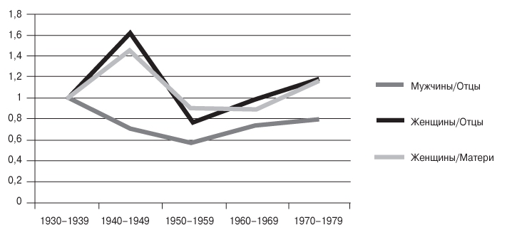 Что касается образовательной мобильности, то здесь мы наблюдаем резкое снижение шансов женщин когорты 1940—1949 на образовательную мобильность, при том что у мужчин той же когорты они не изменились в сравнении с более старшей (рис. 5).