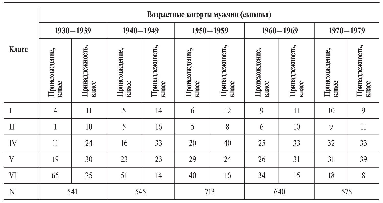 Таблица 1. Классовая мобильность (строка, отвечающая III классу, отсутствует, поскольку не нашлось респондентов-мужчин, которые сами либо их отцы были бы заняты рутинным нефизическим трудом; N — число респондентов в каждой когорте)