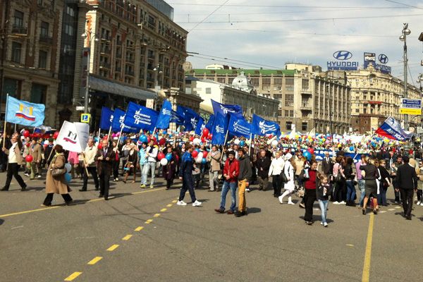 На первомайскую демонстрацию Федерации независимых профсоюзов в Москве вышли первые лица государства — президент Дмитрий Медведев и премьер-министр Владимир Путин. В праздничном шествии приняло участие, по данным МВД, около 120 тысяч человек.