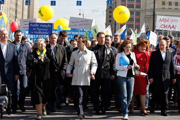 Фото: ИТАР-ТАСС В Москве состоялось грандиозное первомайское 120-тысячное шествие членов профсоюзов, которое возглавили Владимир Путин и Дмитрий Медведев. Блогеры, посмотрев, как народ прошелся по Тверской, сразу же вспомнили советские времена.
