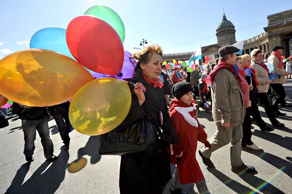 В Санкт-Петербурге на Первомай вышло более 10 тысяч человек. Шествие прошло по Невскому проспекту, колонну представителей профсоюзов, "Единой России" возглавил губернатор Санкт-Петербурга Георгий Полтавченко. На шествие вышли и представители всех оппозиционных организаций — "Яблока", "Другой России", "Солидарности", "Обороны", РНДС, представители секс-меньшинств, Пиратской партии. Во время шествия 10 человек с радужными флагами были задержаны за пропаганду гомосексуализма.
