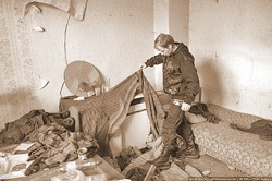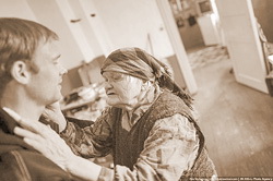 Заходим в гости к бабе Кате. Миша приходил помогать ей по хозяйству. Она учила его работать по дому, разрешала жить у нее. Учила хозяйству. 2 месяца назад у бабы Кати умер сын. В Афганистане он потерял зрение. Далее были бесконечные попытки добиться от государства компенсации, несколько неудачных браков, в результате которых он лишился квартиры и остался должен ушлой жене алименты. Потом он начал пить, от чего и умер в 53 года.