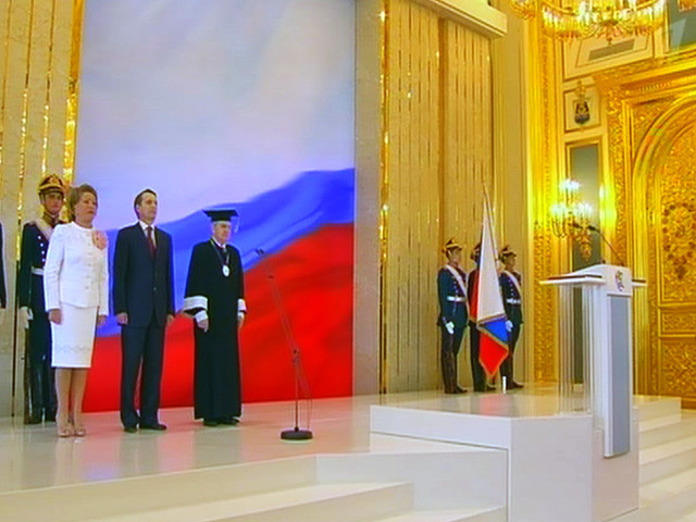 Путин приносит присягу президента Российской Федерации. В заключительных словах пообещал "верно служить народу". Играет гимн.