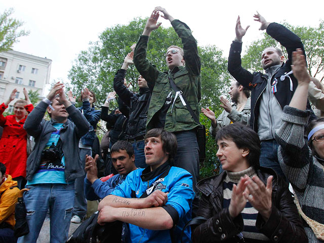 Между тем оппозиционеры с белыми лентами пикетируют здание изолятора временного содержания на юге Москвы, где содержится арестованные лидеры участников акций протестов Сергей Удальцов и Алексей Навальный.