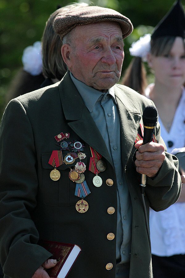 От лица ветеранов говорил Макаров Сергей Сергеевич. Ушел на фронт в 17 лет. Дошел до Псковской области, где был ранен в обе ноги и в руку в марте сорок четвертого. До сентября лежал в госпитале, после чего вернулся домой. На фронте в 42-м погиб отец Сергея Сергеевича. Только один раз они встретились с отцом во время войны, еще в Рязанской области, под Шацком.