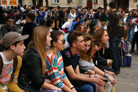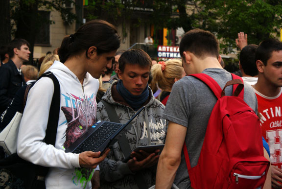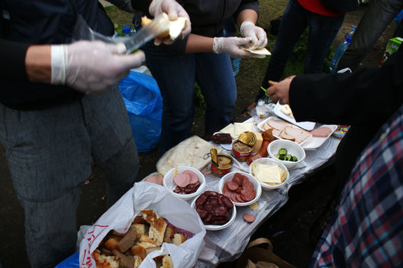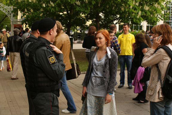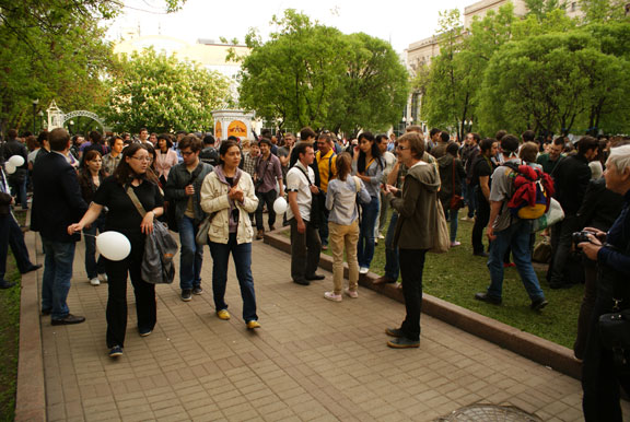 Ну а что: организация присутствует, кормят (чем, кстати, пользуются многочисленные обитающие в районе Чистых прудов гастарбайтеры, некоторые из них даже белые ленты себе приклепляли, говорят, чтобы еды получить), охрана есть, дисциплина в наличии. Опять-таки «сухой закон». Курить, правда, никто не запрещает, палатки полиция ставить не разрешила да отбой и побудку не объявляют. Накануне ночью поэтому «лагерь» представлял собой весьма милое зрелище. Два-три десятка спящих, десятка три продолжающих что-то обсуждать или просто сидящих неподалеку от памятника и человек тридцать, играющих в «Язык жестов» (игра, где надо без слов объяснить некое слово или понятие). Слова загадывали разные, в том числе и «тематические», вроде слов «вброс» или «глобализация», хотя были и «козинаки» (блюдо, впрочем, грузинское). И впрямь — культурный досуг и массовые гуляния. Да с небольшим политическим налетом, так как же без этого при массовых-то гуляниях.