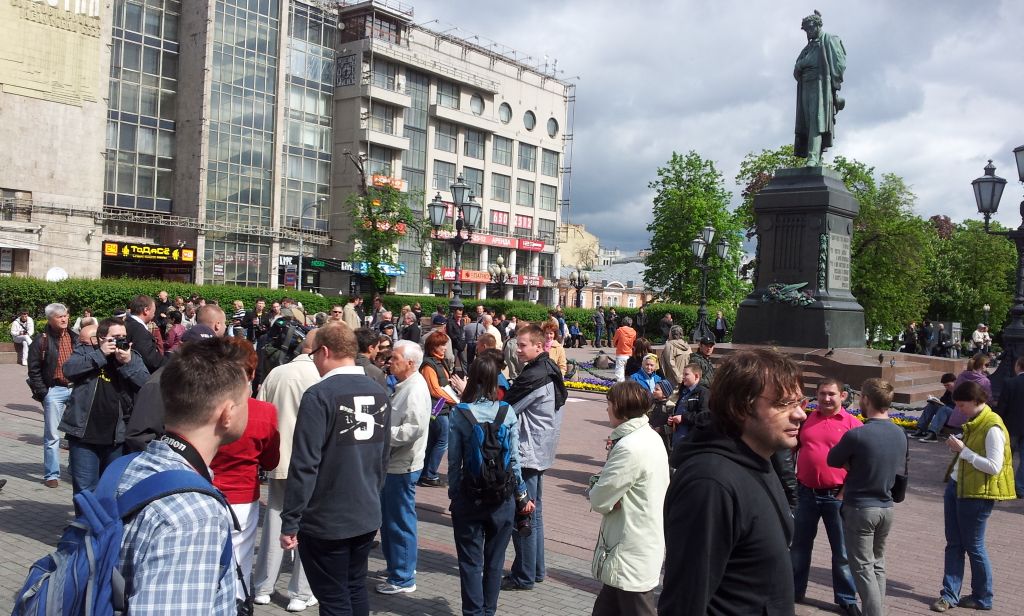 12:15 На Пушке больше тысячи человек. Люди продолжают подходить. Приходят семьями, с детьми. У большинства - белые ленты или другие опознавательные знаки движения "Белый город". Тут же инициатор "контрольной закупки" Борис Акунин. Вместе с ним Дмитрий Быков и Виктор Шендерович. Полиции почти нет. Стоит один полицейский автобус и несколько машин. Часть людей начинают двигаться по бульварам.