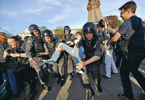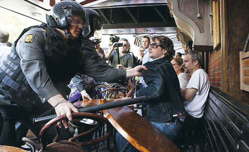 На Малом Каменном мосту и на площади перед кинотеатром «Ударник» были сотни журналистов с камерами и фотоаппаратами. На опубликованных в интернете кадрах хорошо видно, как омоновцы вытаскивают людей из толпы, волочат их по земле, бьют дубинками уже лежащих, тащат молодых девушек и женщин. У корреспондента телеканала «Дождь» Владимира Роменского один из полицейских вырвал из рук айфон и выбросил его в реку. К тому моменту, впрочем, там плавало и несколько омоновских шлемов. «Обычно ОМОН задерживает людей, которые что-то скандируют, на этот раз они забегали в толпу и хватали первого, кто попадется, — говорит антифашист Алексей Гаскаров. — Мне тоже рассекли бровь, когда задерживали людей: они старались попасть по голове. Полиция почти сразу стала всячески препятствовать акции — в итоге это вылилось в бойню».