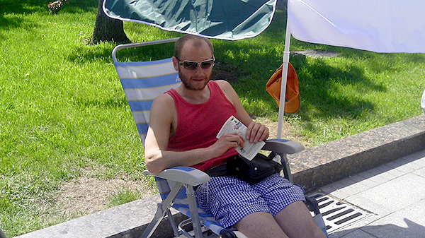 Принимаю участие в #ОккупайАбай с самого начала, с "Героев Плевны". Увидел людей, подошел, разговорился, потом начал ходить на Чистые пруды. Там я играл каждый день, развлекал всех. Мне и здесь, и там нравится. Люди-то те же самые. К легализации лагеря я, конечно, отношусь положительно. Не важно, как это будет называться. Убеждения людей от этого не изменятся.