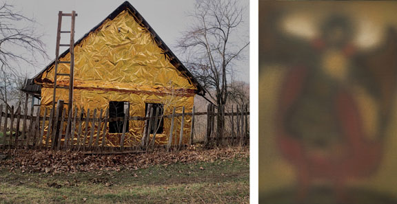 Елена Суховеева, Виктор Хмель, «Золотая осень», 2007; Николай Макаров, «Святые», 2008 Хмель и Суховеева покрыли золотистой фольгой обыденные вещи – лестницу, колодец, остатки трапезы, дорогу. Золотой иконный фон касается повседневного быта, и становится видно, как Бог следит за каждым днем нашей жизни. На картинах Макарова святые предстают размытыми очертаниями – и приходится с усилием вглядываться, чтобы различить силуэт. Быть ближе к Богу – для верующего постоянный труд над собой, преодоление своей природы.