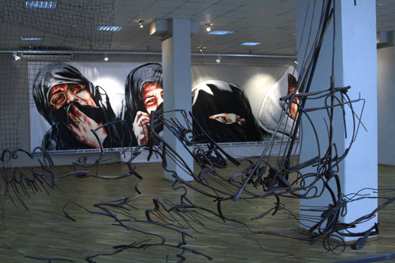 Дмитрий Врубель, Виктория Тимофеева «Евангельский проект», 2007-2008. Фото: Сергей Калинин «Евангелие от Луки, 23:28-32: Иисус же, обратившись к ним, сказал: дщери Иерусалимские! не плачьте обо Мне, но плачьте о себе и о детях ваших, ибо приходят дни, в которые скажут: блаженны неплодные, и утробы неродившие, и сосцы непитавшие! тогда начнут говорить горам: падите на нас! и холмам: покройте нас! Ибо если с зеленеющим деревом это делают, то с сухим что будет?» На первом плане – работа Дмитрия Гутова «Христос во время бури на море Галилейском».