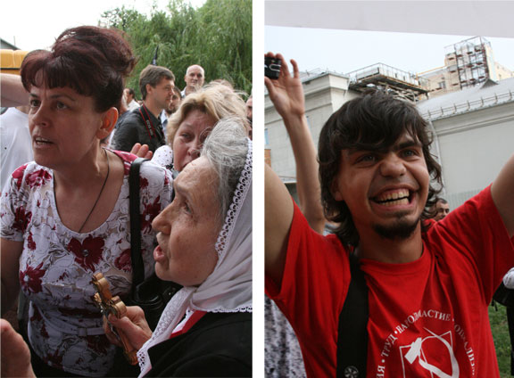 В день открытия мракобесы появились, причем будто бы порознь, представляя как бы совершенно разные общественные группы – десяток ряженых казаков в ненастоящих, сувенирных формах, десяток старушек с крестами и иконами под предводительством бородатого пожилого мужчины, три молодых человека в майках и с флагом ЛДПР, пара коммунистов, и несколько человек из «Сути времени» Кургиняна. Также, рассеявшись среди толпы, пришедшей посмотреть выставку, стояли около двадцати молодых людей, тоже, можно, сказать в форме – спортивные штаны «Адидас», с короткими стрижками, на майках и кепках у некоторых был изображен коловрат, хорошо известный как аналог свастики. Позже несколько людей, пришедших на открытие, рассказали мне, что видели, как эти молодые люди выгрузились из автобуса, припарковавшегося на соседней улице.