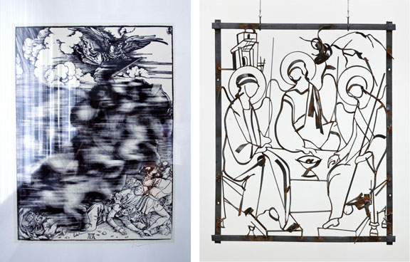 Юрий Шабельников «Уже?», 2003; Дмитрий Гутов, «Троица», 2011-2012 Шабельников увеличивает скорость апокалиптических всадников из гравюры Альбрехта Дюрера, размазав их контуры в «блюре» - как будто в наше время скорость подачи информации превышена настолько, что мы не заметили, что конец света уже начался. Гутов воспроизводит прориси к иконам в объеме, из полосок металла – сбоку они могут смотреться как абстракция, и есть только одна правильная точка зрения, где изображение становится понятным – лицом к лицу.