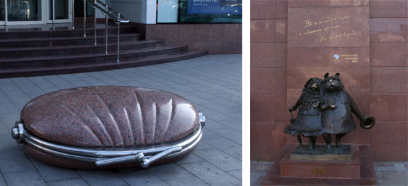 Краснодарские городские монументы – памятник кошельку и бронзовые песики с цитатой из Маяковского «Это ж не собачья глушь, а собачкина столица». Фото: Сергей Калинин Выставку «Лес» в краснодарской программе сразу можно было отметить как прогресс по сравнению с Пермью – там возник конфликт между инноваторами и консервативной творческой общественностью, которая возмущалась, что все «привозное» и не способствует продвижению местных авторов. Но надо понимать, что там не было современных художников, которых можно сразу включать в выставки, которые строятся на принципе художественного качества, а не районного представительства. Там нужно было ждать, пока местная художественная сцена поймет, что такое мировой уровень, в Краснодаре же, кроме упомянутых Мигачева и Казаса, много современных авторов.