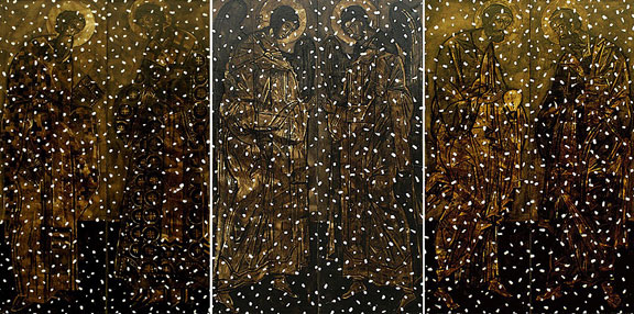 Илья Гапонов, Кирилл Котешов «Пасхальный снег. Последний снег. Снежность. Пыль и снег», 2008 Художники изображают потемневший от времени деисусный чин – и скорбят о том, что время поглощает священные изображения. Белые точки – то ли снег, который идет в храме, и значит, этот храм заброшен и стоит без крыши. А может, это не снег, а насечки, которые делают на старых фресках, чтобы положить новый слой штукатурки и сделать новую фреску. Или следы от пуль, которыми расстреливали фрески большевики.