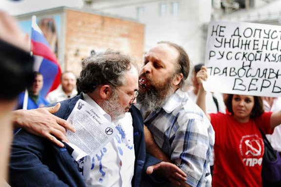 Полиция довольно продолжительное время любовалась на то, как протестующие мешают войти зрителям в зал, потом мягко усадила некоторых из них, картинно сопротивлявшихся для прессы, в два комфортабельных микроавтобуса – нам бы в Москву такие «автозаки». После чего полицейские сами встали в оцепление и продолжили делать то же, что и участники маленького несанкционированного митинга – не пускали людей на выставку. Со служебного входа вышел Марат Гельман, и что-то объяснял зрителям, одна из протестующих это заметила, и крикнула молодежи в спортивных костюмах, чтобы они бежали скорее бить Гельмана. Первым подбежал батюшка в штатском и по-христиански смачно плюнул ему в лицо. Гельман в согласии с Новым Заветом мирно утерся платком, прошел вдоль фасада галереи и просочился в зал через главный вход, по дороге беседуя с заинтересованными в искусстве зрителями.