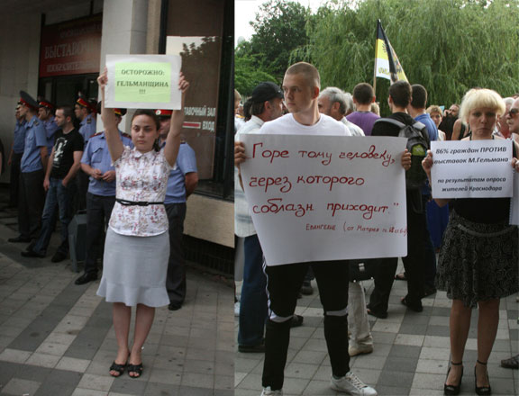 Протестующим пытались объяснить очевидный факт, что Гельман не является автором этих работ, так как он не художник, и как галерист и директор музея он их не выставлял, что этих работ нет на выставке, однако кроме заученных криков «Гельман - вон с Кубани», в ответ не слышали ничего. Может быть, только – «Это ваше личное мнение, а мы представляем мнение большинства». То, что «мнение большинства», присутствовавшего в меньшинстве, основано на откровенно ложных сведениях, а очевидные факты называют несущественным частным мнением – всероссийская традиция мракобесов. Кубанской спецификой оказалось другое – благожелательное поведение милиции.