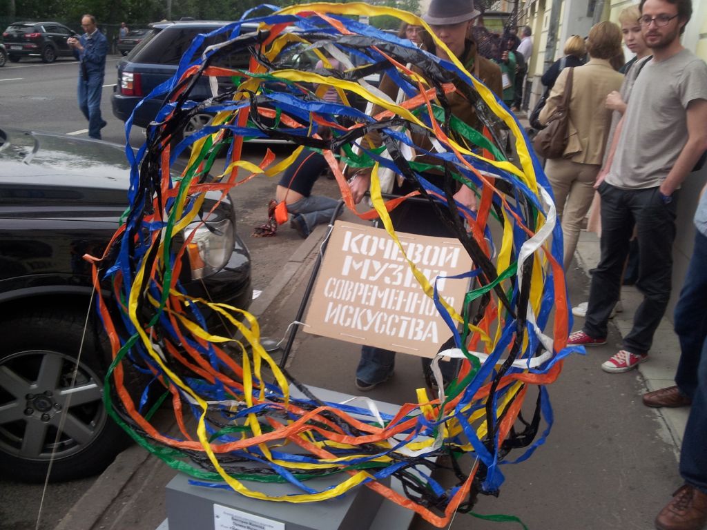 Художники на ручных тележках везли свои работы – картины и другие арт-объекты. Участники передвижной выставки, приуроченной к всемирной акции "Ночь в музее", отправились со Сретенского бульвара по направлению к Пушкинской площади.