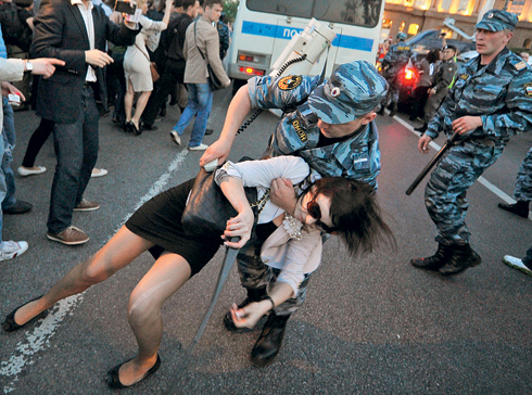 Москва, 16 мая 2012 г. Сотрудник правоохранительных органов «просит» участницу сбора оппозиции на Кудринской площади в Москве покинуть место акции.
