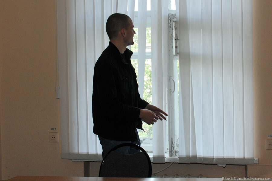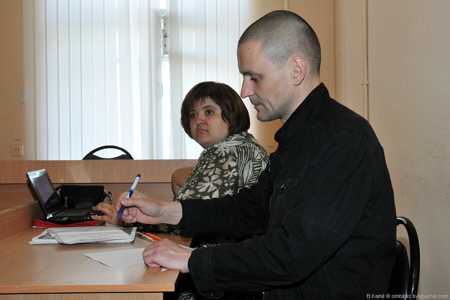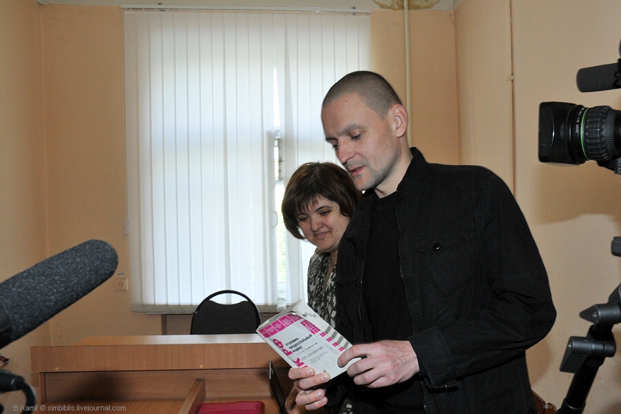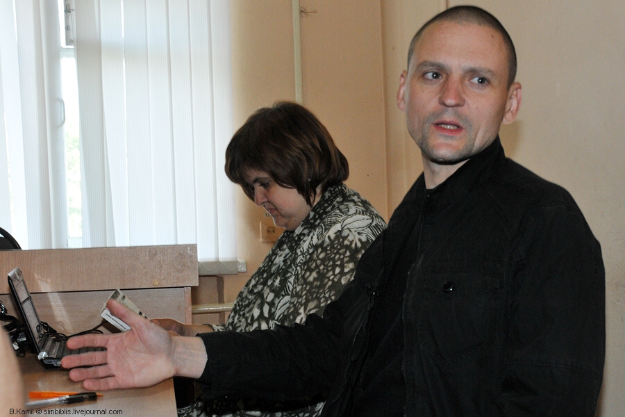 Интересы Удальцова представляет прибывшая с ним из Москвы адвокат Виолетта Волкова, руководитель Московской городской коллегии адвокатов. В комнате судебных заседаний Сергей держит в руках Уголовный Кодекс РФ: