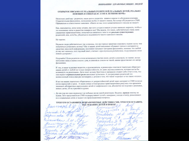 "Несколько дней мы - родители, наши дети и педагоги - живем в каком-то абсурдном кошмаре. Отвратительная фальшивка, написанная якобы от нашего имени, без конца обсуждается в СМИ. Официально и ответственно заявляем: "Никто из нас этого клеветнического письма не писал!" - говорится в подписанном 25 родителями открытом письме, которое находится в распоряжении NEWSru.com.