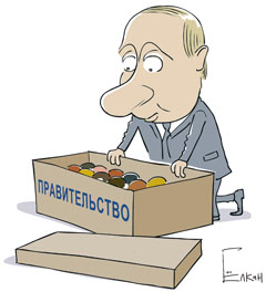 Чтобы ни у кого не оставалось никаких иллюзий насчет того, где находится настоящий центр власти, Путин трудоустроил аж девятерых членов своего бывшего кабинета (включая ранее ушедшего руководить администрацией Сергея Иванова) на «хлебные должности» в Кремль — помощниками, советниками, членами Совбеза. В прежние годы министры порой тоже переходили на работу в администрацию (Михаил Лесин, Сергей Франк, Леонид Рейман), вспоминает Евгений Гонтмахер, но никогда этот процесс не носил столь массового и демонстративного характера. «Путин явно дает понять Медведеву и новым министрам, что в Кремле создано параллельное правительство из «аксакалов», — утверждает Гонтмахер. Эксперт напоминает, что должности помощников главы правительства — это не синекура: именно от этих людей зависят подача информации первому лицу и подготовка «правильных» решений. Еще одно важное кремлевское назначение: место уволенного главы Управления внутренней политики Константина Костина занял вице-спикер ГД Олег Морозов.
