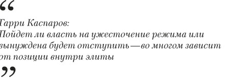 Каспаров: У меня сложилось впечатление, что на сегодняшний день значительная часть профессионального корпуса, которая обеспечивает в разных своих ипостасях нормальное функционирование хозяйственных и государственных механизмов, категорически не готова рисковать личным положением для того, чтобы поменять ситуацию в стране. Между тем вопрос, пойдет ли власть на ужесточение режима или вынуждена будет отступить, во многом зависит от позиции внутри элиты, внутри профессионального сообщества: на одних штыках и гэбэшных разводках эта власть не устоит.