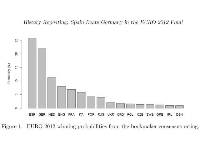 Как утверждают ученые из университета Инсбрука, на Евро-2012 победу одержит Испания. Эти же ученые правильно определили победителя последнего мирового чемпионата, они же четыре года назад дали верный прогноз на европейский чемпионат, проходивший в Австрии и Швейцарии. В обоих случаях, напомним, побеждали испанцы.