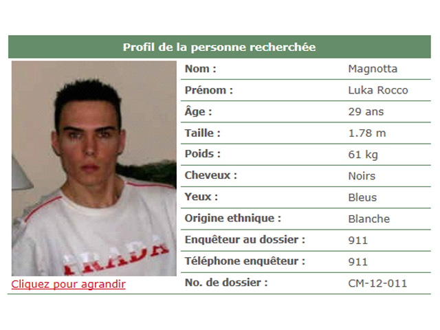 Между тем ориентировки на Маньотту вместе с его фотографиями были распространены по всем полицейским участкам Канады: стражи правопорядка разыскивают белого мужчину, ростом 1,78 м, весом 61 кг, с голубыми глазами и темными волосами. Подозреваемый объявлен в федеральный розыск.