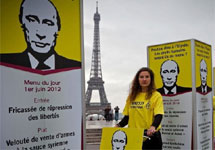 В Париже по случаю рабочего ужина Владимира Путина с Франсуа Олландом активисты французского отделения Amnesty International выехали на улицы на электрических самокатах с плакатами, на которых под портретом Владимира Путина было указано его меню: фрикассе из попранных свобод, суп-пюре из продажи оружия под соусом "Башар Асад" и чеченский десерт с сиропом из убитых мирных жителей.