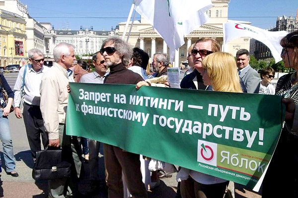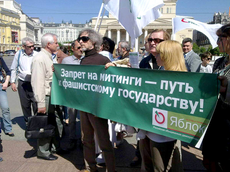 Свой протест против поправок в закон о митингах выразили также другороссы, развернувшие растяжку возле здания Госдумы, за что были задержаны ОМОНом. Всего полиция задержала около 70 протестующих, в том числе и лидера партии "Яблоко" Сергея Митрохина с 17 сторонниками. На Театральной площади прошел согласованный пикет "Яблока", в котором участвовали несколько десятков белоленточников.